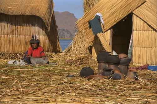 El llac Titicaca està situat a 3.820 metres d’altitud. Hi anem des de Puno. Llueix un bon solet damunt les teulades blanques. El llac té una superfície de 8.200 Km2 (fa 170 Km de llarg i el fons pot arribar a uns 250 metres.) La meitat pertany al Perú i l’altra a Bolívia. El nom ve de titi, que vol dir el déu puma i caca, la chinchilla. Naveguem amb una barca dels nadius de Taquile, vella, a velocitat mínima. El guia ens dóna un bon grapat de fulles de coca per mastegar. A la riba hi ha moltes algues verdes, anomenades llentilles, que utilitzen d’abonament. Parem en una illa artificial flotant, dels Uros, reduïda i construïda damunt d’arrels de totora, una mena de palla. La primera sensació en trepitjar-la és de fals moviment. Hi han construït unes quantes cabanes; unes dones estan preparant el dinar; el combustible que fan servir també és totora. Viuen dels tubèrculs i de la pesca i per fer-se el sobresou, venen teixits. Compro uns dibuixos fets per nens; el pare em diu: el meu fill, el meu fill n’és l’autor. No parlen castellà sinó aymarí.
