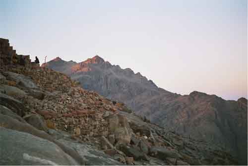 La península del Sinaí, a Egipte, té 56.000 Km2. A les 22 h marxem en cotxe des de Xarm el Xeik cap a Numeiba. Passada mitjanit arribem al poble de Santa Caterina; més endavant hi ha l’entrada al recinte de la muntanya, on ens adjudiquen un guia beduí, segons ordres del govern. A Egipte n’hi ha 1.300.000. Sense dir ni un sol mot, el jove comença a caminar davant nostre. Són la una tocades. Hi ha dos camins per pujar amunt; un que van fer els monjos, més curt però més difícil i el que anem nosaltres, més llarg però més fàcil. La primera part és sorrenca, cosa que cansa molt. Passem per davant del monestir, situat a 1.570 metres, i després el camí es va fent pedregós. Hi ha quart creixent. Puja molta gent. Sovint trobem, en un revolt de la pujada, una caseta on fan te, cafè i venen aigües, ganyips i derivats. Es beduí ens explica que fa el camí unes quantes vegades a la setmana. S’estima el desert, viure sota els estels, de nit, i mirar-los, fer un foc, menjar i beure te, pujar a camell i cavalcar… Milers d’estels damunt nostre. Si mirem enrera, un sender de cuques de llum va pujant lentament pels revolts. Arriba un punt que el camí es fa més estret, amb més pendent, i una mena de graons (uns 700, diuen que hi ha). Cap a quarts de cinc arribem a l’última estació; entrem dins d’una jaima amb jarapes i taules llargues i fem un te ben calent que ens reconforta. A fora fa un fred que pela. Encara queda estona perquè surti el sol. Passades les cinc del matí sortim. Centenars de persones venen aigües, pedres, lloguen mantes i matalassos. Costa trobar un lloc tranquil des d’on poder veure la sortida del sol. Va fent-se clar. Les muntanyes de granit del voltants, impressionants, van canviant de colors i nosaltres som l’eix. Només ens guanya, al fons, la muntanya de Santa Caterina, que és més alta (2.600 metres). Nosaltres som a 2.285.
