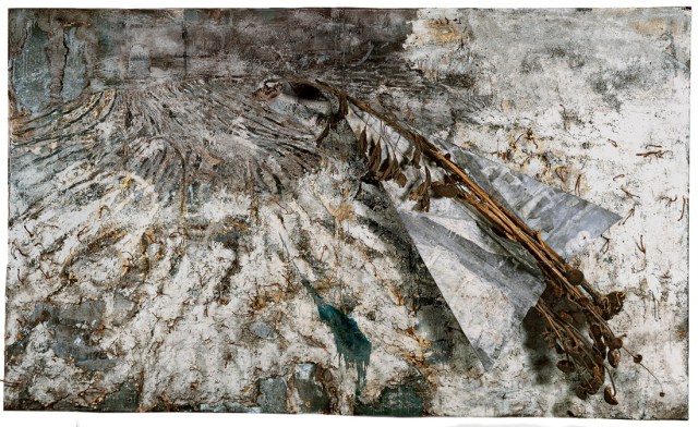 Un quadre d’Anselm Kiefer de 15 metres d’alçada que representa un paisatge d’hivern. De cop, sents fred, solitud i un temor que no saps definir. Kiefer comparteix inquietuds i preocupacions amb el poeta romanès Paul Celan, com el sentiment de pèrdua i malenconia, i la convicció que la memòria ha de preservar-se com única manera d’assimilar els traumes de la història dels éssers humans. Marcat per la vivència de la segona Guerra Mundial, aquest alemany fill de pares morts en un cap de concentració va néixer el 1945. Conscient de pertànyer a una nació dividida, no creu que hi hagi una única veritat, sinó interpretacions diferents. Genial la sèrie de pintures de camps nevats, grisos, amb branques i una perspectiva tan definida que a mesura que camines cap a la tela, et sembla que entraràs en el camp que tens al davant i passaràs fred, por i et sentiràs sol. L’obra de Kiefer gira al voltant de la mitologia, la història, la religió i la simbologia com a mitjà per evitar l’oblit de les brutalitats i tragèdies de la Segona Guerra Mundial. Fa servir colors grisosos i materials com el plom, filferro, palla, guix, fang, cendra o pols. Para Khlebnikov, una sèrie de pintures dedicades al visionari poeta rus, tracta del convenciment que les catàstrofes bèl·liques navals es produeixen cada 317 anys i reprodueix vaixells que floten a l’aire. La ciència i el destí són el tema principal d’una altra sèrie inspirada en l’observatori que el Maharajá indi Sawai Jai Singh II, matemàtic i astrònom, construí per contemplar el firmament; a les obres apareixen constel·lacions esquitxades d’instruments de medició, com rellotges de sol. A Dones de la Revolució aprofundeix en la identitat i l’experiència de la dona en dos períodes històrics diferents, inspirades en un llibre de Jules Michelet. En una immensa sala, et trobes desenes de llits de plom amb fotografies i textos escrits a la paret que recorden les dones oblidades de la Revolució Francesa. Impressionant. A Dones de l’Antiguitat trobem maniquís de dona sense cap, amb vestits de crinolina blanca, que representen personatges mitològics i històrics, heroïnes o malvades, però totes fortes. Per exemple, Berenice, una princesa egípcia del segle III aC, amb una llarga cabellera que, segons la llegenda, es convertí en una constel·lació. La vida secreta de les plantes és un fresc de 28 pintures amb branques, plom i filferro, a partir d’una idea de Peter Tomkins i Christopher Bird, que analitzaven la natura sensible de les plantes i com podien donar resposta als misteris del nostre món.