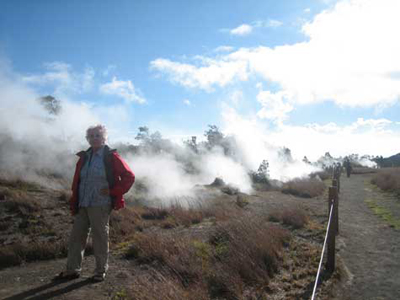 Al cràter Pahuai hi ha un trencant que duu a un pàrquing final i d’allà es pot caminar fins al mirador del Pu’u O’o. Cau una pluja fina que ens va calant i hi  ha força boira. Caminem sobre lava envoltades d’algunes falgueres no gaire grans i arbres “lehua.” Paisatge de desolació. No podem anar a Napau perquè cal un permís especial. Comencem a pujar entre una zona arbrada fins dalt; se suposa que es veu el cràter actiu del Pu’u O’o, però la boira ho impedeix. Estem soles. El vent xiula entre els arbres. No hi ha fantasmes però sí un cert desassossec. No és l’única caminada que fem. Un altre dia anem al Kilauea Iki trail: caminem sota falgueres d’un bosc nadiu, baixem al cràter, a 122 m, passem pel mig, entre lava trencada (del 1959) i fumaroles, impressionant. A l’altra banda, pugem novament. Trobem alguna gent, poca, i comença a caure una pluja fina (de fet, tota l’estona ha estat núvol). Quan tornem a ser a dalt, a l’altra punta, calculem que hem trigat unes dues hores (6,4 Km) caminant tranquil·lament i observant.