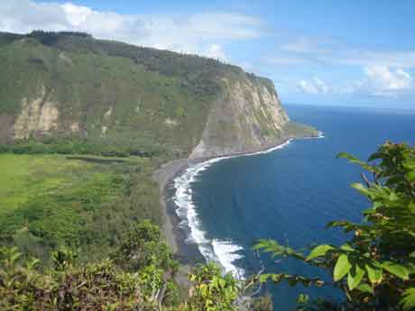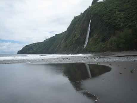 La vall de Waipio, a Big Island (Hawaii) és verda i humida. El desnivell del camí asfaltat per anar fins a la platja és del 25% i hi deixen circular 4×4. A baix, a tocar d’un riu ample i amb força aigua es pot acampar, amb permís. Cap a la dreta hi ha la cascada; cal caminar entre pedrots però val la pena, perquè és gran i arribes al peu mateix; la força de l’aigua, des de l’alçada que baixa, és terrible. Després anem cap al riu que separa aquest tros d’una ampla platja de sorra negra. No és profund, però l’aigua baixa amb molta força (sort que portem els pals i les sandàlies). A poc a poc, el passem. Ja a l’altra banda, es veu perfectament la cascada d’on venim. No hi ha ningú i les nostres ombres es reflecteixen a la sorra mullada. El riu és la frontera, i és que la gent que ve amb algun “tour” organitzat tenen prohibit creuar-lo. Per terra, cocos, guaiabes, mangos, plàtans, pinyes i troncs d’arbres secs, caiguts. Caminem fins al final de la platja. Per aquesta banda es pot pujar a l’altra costat de la vall, però no ho fem perquè llavors el cotxe ens quedaria a la banda d’on hem baixat. Seiem al costat d’uns troncs caiguts. Intentem, debades, obrir un coco i ens remullem una mica. Potser ens hi hauríem estat més, però de l’interior es veien uns núvols negres que feien fressat i iniciem la tornada. De la platja al mirador hi ha 300 metres de desnivell, que anem pujant a poc a poc, defugint amablement l’oferta d’una furgoneta de pujar-hi. Quan arribem dalt, el guàrdia (que havia anotat en un registre que baixàvem) i dos companys ens aplaudeixen.