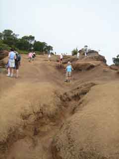 Des del Pu’u o Kila, amb noves vistes sobre la vall, comencem el camí, amb una baixada impressionant, però les pujades que després trobem ens fan témer la tornada. Ens envolten falgueres enormes i arbres de fulles verdes que al final floreixen en punxes vermelles, el lehua. Quan a la fi arribem al mirador, a 1.306 m, no es veu res, perquè la boira ha anat pujant, just per compartir el moment amb 4 persones que hi ha arribat abans que nosaltres, per cert, un amb un trípode enorme i una càmera genial, que no li serveix de res.