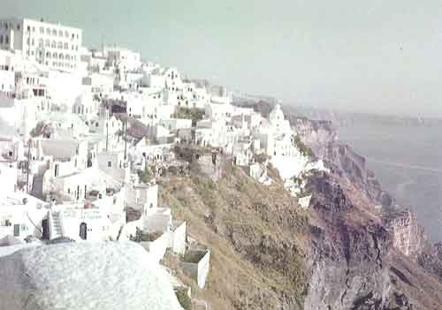 L’illa té forma de crusant i al voltant hi ha les illetes de Nea Kameni i Palea Kameni, a mes de Terássia. Ens allotgem a Messaria, a uns 10 km de la capital, on ens passen un parell de coses curioses: un capvespre pels carrerons, traiem el nas per la porta mig oberta d’un pati on hi ha gent que canta i balla. Surt un home gran que ens convida a seure, treuen gots i menjar i ens hi passem més de 4 hores, xerrant i ballant! Un altre dia, després de sopar a la taverna habitual, se’ns acosta una noia que ens explica que l’endemà es casa amb el seu company, un xicot negre que els seus pares no accepten; són nord-americans. S’han fixat en el vestit blanc que porta una de nosaltres i ella ens el demana per celebrar la cerimònia. Així ho fem i l’endemà ens el tornen. Ja són marit i muller.