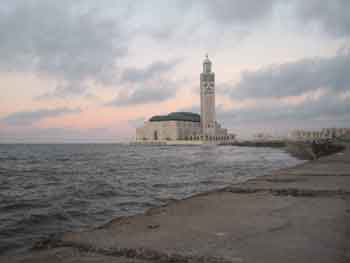 El més espectacular de Casablanca és la mesquita de Hassan II, inaugurada el 1993, tot luxe, tot marbre. La quitxalla juga, les dones enraonen, les parelles es miren. A la petita cala de sota, hi ha xicots que es banyen i d’altres juguen a futbol. La marea va pujant i el sol baixant. El capvespre és aquí. Passen unes noietes i una diu: “C’est magnifique, n’est-ce pas? Li diem que sí; insisteix, somrient: C’est genial, n’est-ce pas? Sí. I continua: C’est une merveille!” La gent seu en el pedrís que envolta la mesquita. Miren el mar, mengen crispetes, alguns pesquen. La barreja dels colors dels seus vestits crida l’atenció: blaus, vermells, grocs, blancs, roses, negres… ulls foscos i profunds de les nenes que encara es poden permetre el luxe de fer voleiar els cabells a l’aire. El sol ha tacat de vermell el blau del mar i del cel. Per uns moments, sembla que la gent calla i el jocs s’aturen, però és un miratge passatger. El venedor que ven crispetes crida, una onada avança més del previst i mulla una colla de noies que criden i riuen. La mesquita es comença a il·luminar. Serà fosc, però es podrà veure de lluny. La mirada d’Al·là arriba a tot arreu. Anem caminant fins a un restaurant de la corniche d’Aïn-Diab a sopar. La nit és jove.