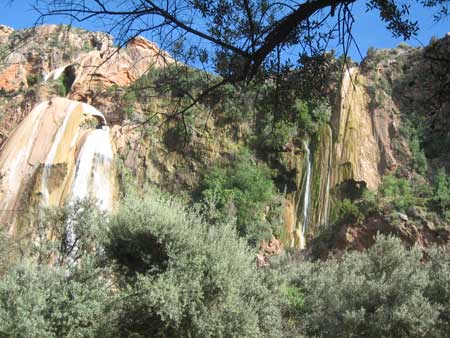 Anem a les cascades des de la costa, pujant per la Vall del Paradís, per una carretera de revolts pronunciats envoltada d’ametllers, argànies, oliveres, baladres i ruscos de mel. Allotjades a l’Hotel des Cascades a Imuzzer, baixem a Timouzen ou Tanane. Com que són massissos porosos i terrenys secs, la vegetació aprofita punts d’aigua per créixer. Quan plou, l’aigua s’infiltra per les roques de carboni i es fa carbonatada. Amb els canvis de temperatura es converteix en quelcom sòlid i es va fent una mena de crosta arrebossada de calci. El que veiem té milers d’anys. Estan bé, però per entendre’ns, les de S. Miquel del Fai, si ha plogut, són més ufanoses.