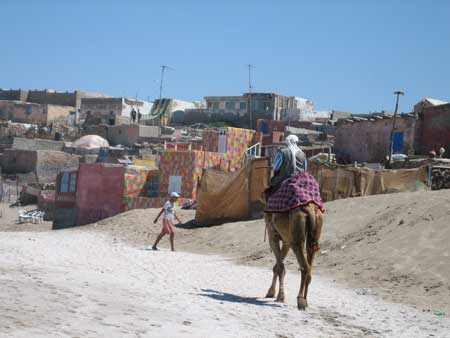 Al Parc nacional del Souss Massa, parada al poblat pescador de Tifnit, amb catifes de petxines trencades i musclos al rocam. Amb una encalada a les casetes seria el paisatge ideal, però la pintura blava i blanca s’ha despintat i sentim pudor d’escombraries.