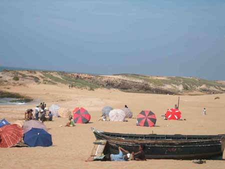 Baixant per la costa ens aturem a dinar a la platja d’Ualidia, una graellada de peix i marisc. Tota la gent era del país i nosaltres ens afartem de llamàntol, garoines, gambes, musclos, petxines, peix blanc… i vi, per uns 20 € cadascú. Caminem per la platja, per pair.