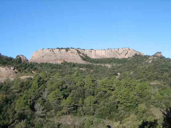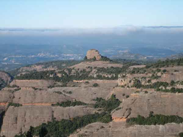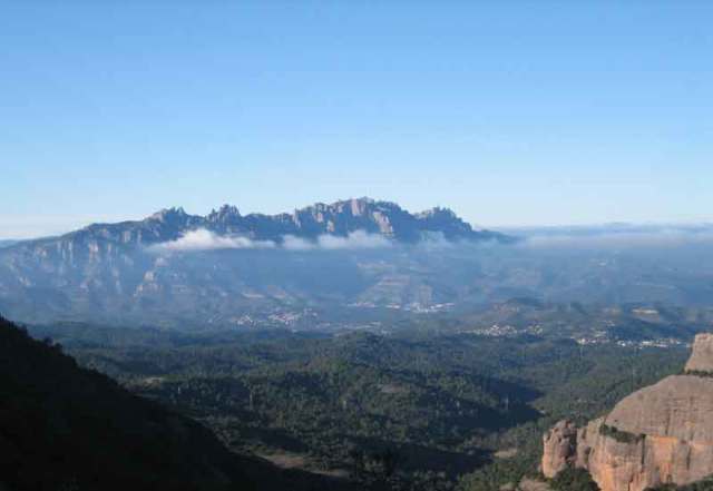 Pugem amunt per corriols i senders fins arribar a la carena des d’on veiem la majestuosa forma del Castellsapera i el Queixal del Porc a la punta. Arribats a la carena del collet Estret assolim el mirador al massís de Montserrat amb el Paller de tot l’Any i la Roca Salvatge en primer pla. És un dia molt clar, amb sol, tot i que fa fred i la visibilitat és genial. Pel bosquet del sender recollim farigola i romaní olorós.