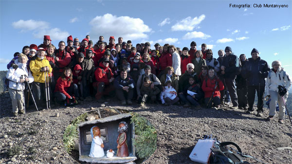 Finalment arribem a la Roca del Corb, amb vistes a 360º: al davant, la Mola, enllà el Montcau, al fons els Pirineus nevats, més enllà Montserrat, el Tibidabo, les xemeneies de Sant Adrià del Besòs, els Vallesos… Hi fa un vent fredot que ens obliga a tapar-nos bé. Quan ja hi som tots (els 134 que hi hem pujat i que ocupem tota la roca), plantem el pessebre i cantem les nadales; després, unes neules i un xic de vi dolç ens ajuden a baixar. Ho fem directes pel sender que ens porta directament a la Barata.