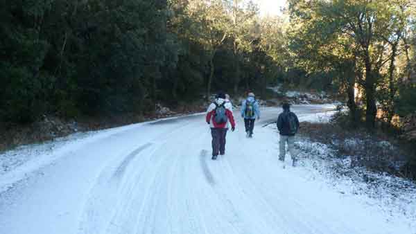 Trepitgem neu i aguantem el fred, amb la sort de tenir un dia assolellat i clar. Baixem cap al Boix i arribem a les muralles, al turó de Montgròs, a 750 m d’altitud, en una peninsuleta plana sobre l’afrau del Montanyà, envoltada de cingles per totes bandes excepte per un; des d’aquest indret es controlava una de les vies de penetració a la plana de Vic des de la costa, per coll Formic. La fortificació era la defensa per l’únic punt vulnerable, l’oriental.