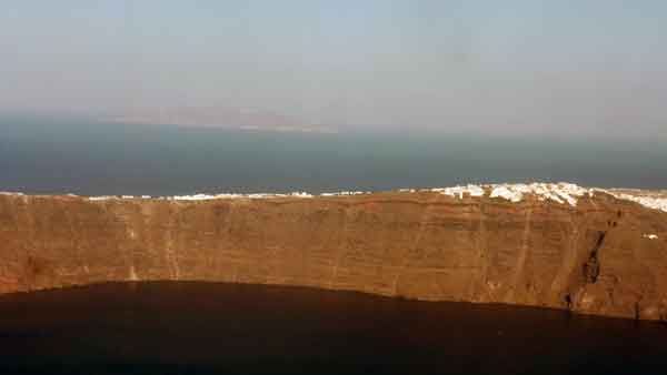 Baixant cap al sud tenim vistes de la caldera i les illetes del mig, Nea Kameni i Palea Kameni. Més enllà, Tirássia. Amb això tanquem la caldera. A prop, la platja Kokkina, la millor, al nostre gust, i a la punta del cap Bounó, un far amb vistes superbes a tots els punts cardinals. A l’interior, pugem per la muntanya de Profeta Eliás des de Pírgos, un poble encantador: des de dalt, vistes magnífiques.