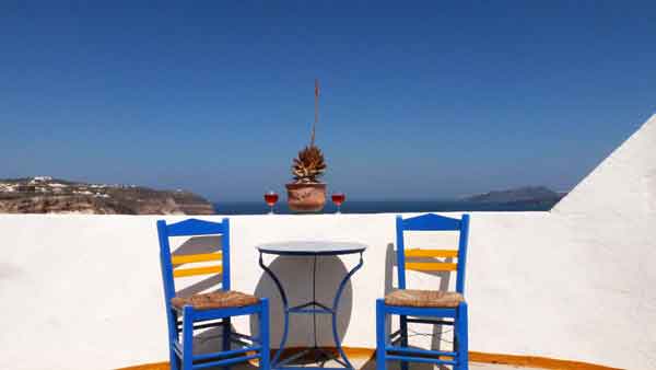 Ens allotgem a l’hotel Afroditi, a Firostefáni, al nord de la capital, un lloc molt recomanable. Arribem just a temps de veure la posta de sol diu des d’una església de cúpula blava, a un centenar de metres. Des del penya-segat d’aquesta banda tenim el sol a l’horitzó i al davant, les illes que un dia formaven la caldera del volcà.