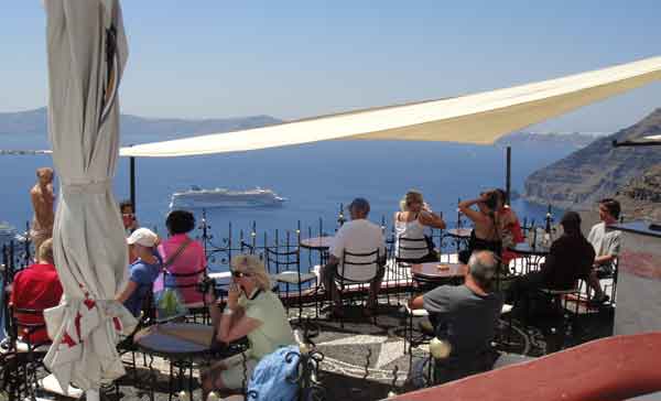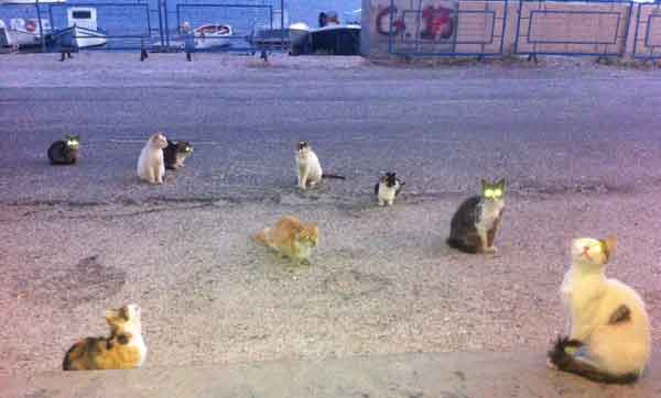Els creuers vomiten turistes traslladats a Fira en barques i funiculars. Compren, mengen, beuen, fan fotos i se’n va, així nosaltres ens quedem més tranquils. Els carrers es buiden, la calma torna, alguna botiga tanca i els gats, finalment, prenen de nou els carrers.