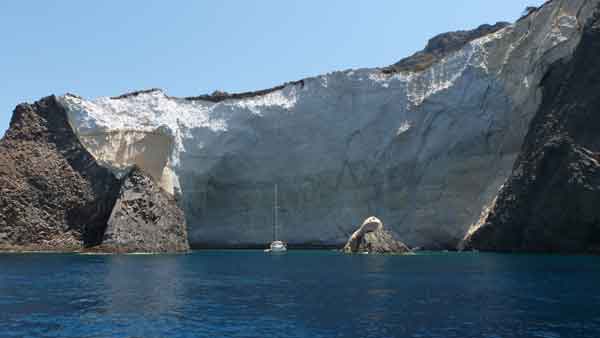 Passem per la platja de Kalogriés i anem baixant avall on es veu perfectament el que era la roca inicial (caolí) i la lava que la va anar cobrint. Penjat a la muntanya, el monestir de S. Ioani. Arribem a Sikià, tirem l’àncora i ens banyem. Després pugem a la llanxa amb motor fora borda i entrem per una cova fins a una dolina (va caure un tros de muntanya i es va enfonsar). L’espai és ocupat per l’aigua de mar que hi va entrar i s’hi ha fet una platja. Sortim per una altra banda al mar, pugem al veler i continuem baixant la costa fins doblar el cap de Psalili. Finalment arribem a la zona coneguda com a Kleftikó, aigües turqueses, coves i roques blanques. El paradís recobrat.
