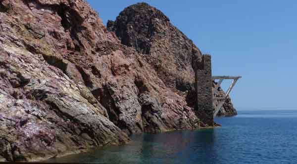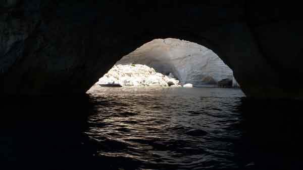 Una part de la costa de Milos només és accessible amb barca. Per això fem una excursió amb un veler; som 9 persones, més dos de tripulació. Passem per davant dels nuclis pescadors de Skinopi, Klima, Aretí i Furkovuni, tots amb el mateix estil d’escars amb portes pintades de colors. Al costat del darrer, la platja de Plaziena. Després veiem els illots d’Arkadies i les roques de Kerlari i saltem cap a l’altra banda, al cap de Vani amb restes de les mines de manganès abandonades.