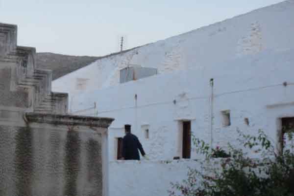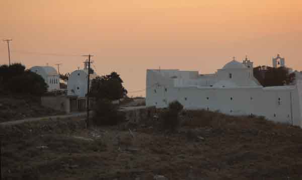 Tornem a la carretera principal i ja veiem l’imponent monestir de Taxiarcos, de murs blancs i alts, amb finestres minúscules i una petita porta pintada de blau. A fora, bens i pollastres. El sol està baixant entre dos arbres imponents, tot vermell. De cop, apareix un pope i ens diu si volem entrar. Ens obre la porta i a dins del recinte trobem una petita església del s. XVI: ens convida a dolços i ens mostra diferents tresors: una pintura de l’arcàngel S. Miquel portada de Xipre, unes làmpades de plata de Rússia, una pedra al terra gravada amb l’any 1620, una armariet de fusta i perles… Sabem que hi ha frescos i manuscrits bizantins, però la visita no dóna per més. Hi dorm sol.