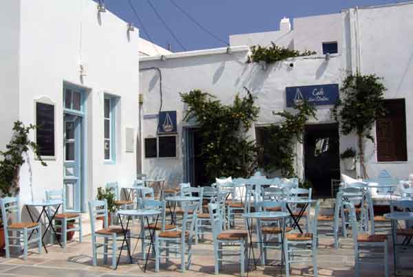 Travessem la muntanya, tot revolts, passem per Pirgos i arribem a la capital, Xóra, al fons i molts més avall. Ja és ben fosc i aparquem a prop de tres molins restaurats i baixem fins a una petita placeta. Amunt i avall tot són escales i hi ha molta animació.