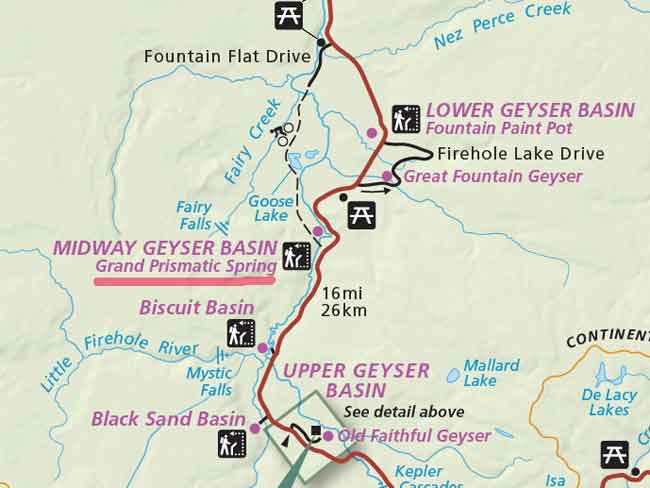 La fotografia la vam fer a Grand Prismatic Spring, situada a Midway Geyser Basin, a Old Faithful, Yellowstone (EUA). Aquesta font fa 112 m de diàmetre i 121 m de profunditat i és la font d’aigua calenta més gran de Yellowstone i la tercera del món. Descarrega 2.119 litres d’aigua per minut al riu Firehole. La temperatura de l’aigua oscil·la entre 63º i 86º. Els colors són a causa de la gran quantitat de microorganismes, fongs i bacteris, així com d’algues i minerals.