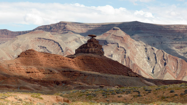 Després de passar de la 50 a la 95, deixant enrera Fallon, hi ha l’arsenal més gran del món, amb dianes gegants i pistes per avions traçades al terra del desert. De Beatty a l’Area 51 hi ha uns 100 km i és on es va rodar la pel·lícula Independence Day. Atxaga explica l’angoixa d’anar amb poca benzina al cotxe i veure que no trobaven cap gasolinera fins que arriben a Mexican Hat, un lloc inconfusible per la roca que simula la figura d’un home amb ponxo i barret mexicà. Allà troben una petita benzinera regentada per una dona navaja i respiren tranquils. Nosaltres vam dinar al restaurant tocant a les aigües marronoses del riu San Juan on un rètol avisa que si vols alcohol has de mostrar el DNI i cal menjar carn. Vam demanar hamburguesa i cervesa, i no ens van fer ensenyar res, segurament perquè era ben clar que passàvem dels 18 anys.