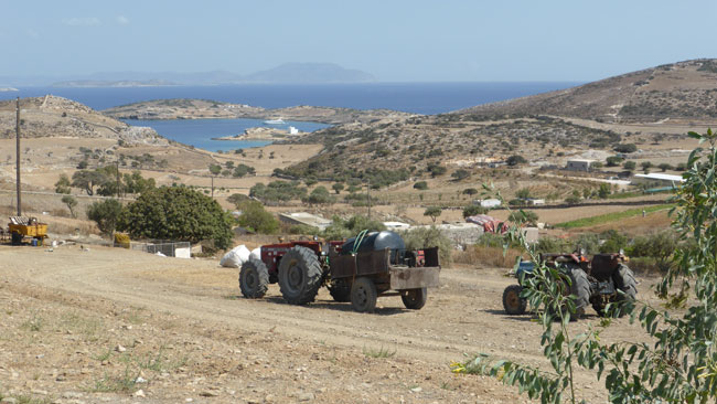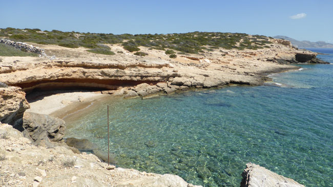 Un dia anem en direcció al turó del Profeta Ilias on hi ha les ruïnes d’un fort del període clàssic. A sota hi ha la platja de Fontana. Retornats al camí principal, un pendent pronunciat baixa a Almiros, una badia amb dues platges de sorra i aigües delicioses. Ens quedem a la primera, amb quatre esplendoros tamarius. Després d’un bany, tirem camí amunt, seguint les indicacions d’un rètol on s’anuncia la taverna hotel Anatoli. I si hi fem un frapé? Entrem en un jardí verd i una piscina amb vistes a l’illa d’Amorgós i quan preguntem per les cales de Bazeu i Lioliu, l’amo, en Nikos pregunta d’on som, per què parlem grec i on ens allotgem. Un cop situat, ens explica que l’illa del davant és Keros, on s’han trobat estatuetes ciclàdiques i altres objectes. Les cales on volem anar són just a sota, diu, però millor que primer anem a una cova molt maca a prop, després aprofitem alguna micro-cala que trobarem per banyar-nos, i acabat, si volem, podem anar a la taverna a dinar. Un home ens obre la tanca i passem per un sender en una propietat privada on pasturen cabres, arribem a una casa blanca i anem vorejant la costa. Veiem la cova des de dalt i retornem. En una de les micro-platgetes que hi ha ens quedem una bona estona, soles, felices, lliures. I retornem a la taverna, és clar, on contemplem els illots amb la presència al fons d’Amargós i parlem de nou amb en Nikos, que s’acomiada de nosaltres amb un: salut i bon hivern.