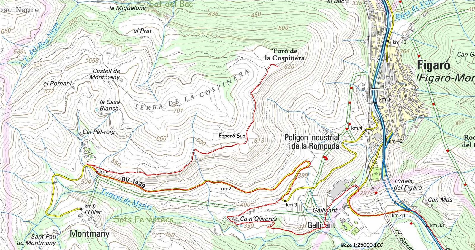 No continuem per aquí sinó que caminen en direcció sud i anem pujant entre boscos d’alzines fins arribar al pla que coincideix amb la pista apta per a vehicles. Poc després ja veiem la creu amb la inscripció El Figaró, la Creu i la Senyera sempre junts amb la Cuspinera. AVF. 11 de setembre de 1995. Som a 620 m. No fa un dia assolellat, però veiem bé el poble del Figaró i el Congost. Intuïm la Garriga i la plana vallesana. De la banda del Montseny, veiem l’ermita de S. Cristòfol de Monteugues i més amunt, el Tagamanent. Cap al sud queda la petita vall dels Sots Feréstecs, que per força ens porta a recordar la novel·la de Raimon Caselles, amb l’angoixa i soledats que t’impregnen en llegir-la.