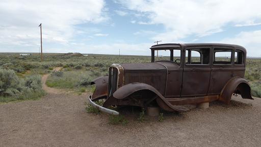 A partir d’aquí cap a l’est, la 66 és com era abans. Desert a ambdós costats. La via del tren. Calor. Set. Res. I de tant en tant, un petit nucli de cases, o un cafè, com a Peach Springs, Truxton, Valentine o Hackberry, on ens aturem perquè ja no podem més. Aquest ens ha semblat el més autèntic del que hem vist. Cotxes antics fets pols, a dins, una dona gran ven begudes (no alcohòliques, quin desesper), ganyips, un jukebox que no funciona, records, un “restroom” amb sorpresa (un maniquí de la Marylin Monroe a dins, quin ensurt)…