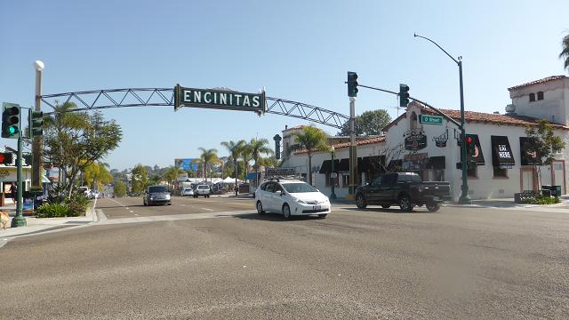 Al sud tenim Encinitas, un poble al llarg de la carretera i la línia de tren. Les platges estan amagades. El primer dia, després de pujar un carrer costerut i veure el mar, no hi podíem accedir perquè una filera de cases privades ho impedien, però de tant en tant hi ha unes escales per baixar, perquè són penya-segats alts i la platja és molt avall. A més, com que hi ha poca sorra, quan la marea puja no queda espai, per això tanquen la platja de 2 a 4 de la tarda, és a dir, posen un prohibit baixar l’escala. Al centre d’Encinitas hi ha un antic teatre, la Paloma (1928), i l’estació de tren. Els ràpids que van de Los Angeles a San Diego no hi paren, però hi ha una mena de rodalies que sí. De nit els sentim com si el tinguéssim a l’habitació.