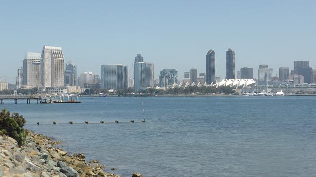 Baixem de la Loma cap al port i l’aeroport, al centre de la badia, passem pel dowtown, amb els gratacels i creuem el pont de 3,41 km inaugurat el 1969 fins a l’illa de Coronado. Just després de passar ens aturem al parc a la riba on les vistes del pont i del skyline són molt bones. La imatge més emblemàtica de l’illa és l’Hotel del Coronado del 1888. Tot és ple d’hotels, restaurants, bars i botigues. Al final de la punta hi ha la platja estatal de Silver Strand.