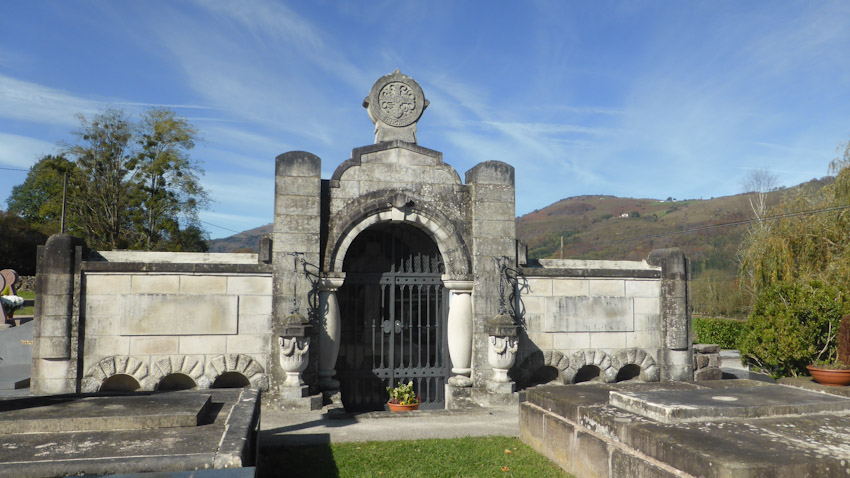 Vemos la tumba del pintor Jabier Ziga, (1878-1960) y nos fijamos de forma especial en el enorme panteón que inspiró a Redondo para explicar la búsqueda de los restos de las muertes de cuna aunque lo sitúa en otro cementerio. “Sobre la cabecera, una estela discoidal con su característica línea antropomórfica… La cabecera del panteón se apoyaba en un murete de media altura…” Ya en la puerta, alzando la mirada, vemos en la parte alta izquierda del cerro, el caserío donde situa la vivienda de la família de Víctor, el marido de Flora “en el camino de los Alduides, es el tercer caserío pasado el cementerio”. Continuando la carretera llegamos al molino de Berro, zona en la que se situa la persecución y búsqueda de Rosario, madre de Amaia, que desaparece en el río.