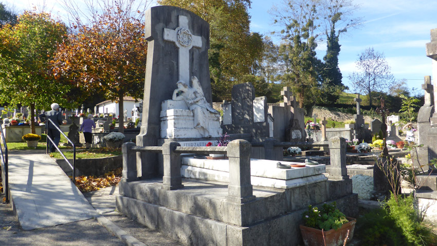 Subimos al cementerio, en el barrio de Anzaborda, en la parte alta “aunque llamar barrio a los tres caseríos que se divisaban desde la puerta del camposant era bastante pretencioso. El cementerio original se encontraba, como era tradición, rodeando la iglesia, que entonces estava junto al ayuntamiento en la plaza del pueblo, hasta que fue trasladada piedra a piedra y reconstruida en el lugar que ocupa actualmente. Lo mismo se hizo con el cementerio, que se trasladó al camino de los Alduides”. Es vigilia de Todos los Santos y está lleno de gente y flores, todo sol y color. “En la puerta del cementerio presidía una calavera que vigilaba desde sus cuencas vacías a los visitantes”. Al entrar, vemos dos elementos naturales, presentes en los cementerios de la zona:“Havía un solo ciprés justo a la derecha de la entrada, un poco más allá un sauce llorón y al otro extremo un haya. Un crucero se alzaba majestuoso justo en el centro del camposanto. Cuatro caminos enlosados dividían el cementerio en cuatro cuartos perfectos en los que se distribuïan las sepulturas”.