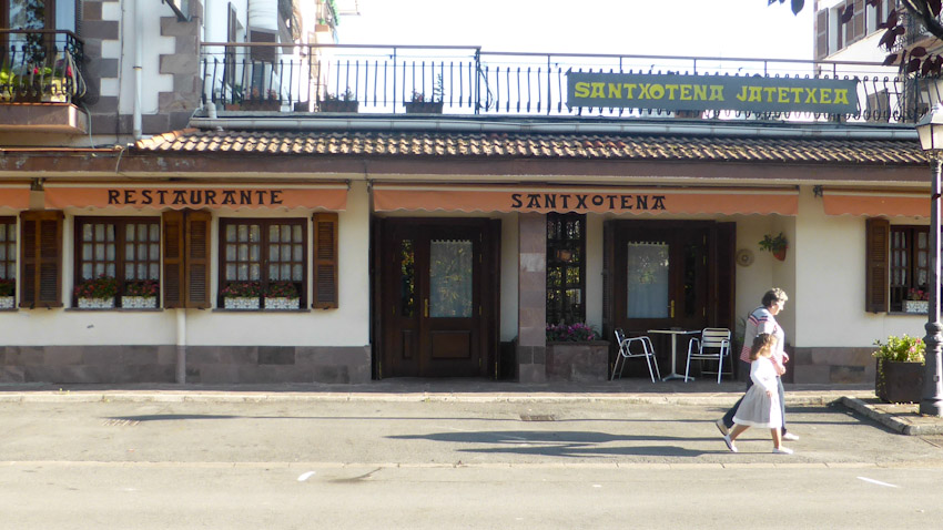 Allí está el restaurante Santxotena, el preferido de James, su marido. “Santxotena era muy acogedor… comenzaba en el exterior con las ventanas, que como en la casita de un cuento, lucían portillos pintados jardineras plagadas de colores todas las épocas del año… Ellos siempre pedían una mesa junto a la cocina, que estaba abierta al comedor, con lo que podían observar el ordenado trajín de tres generaciones de mujeres que se movían por la estancia sin molestarse, como si hubieran ensayado mil veces una coreografía de corte victoriano refrendada por los impolutos delantales blancos que llevaban sobre el uniforme negro… Algunos comensales rezagados se acodaron en la barandilla para hacerse fotos.” Continuando por la orilla río arriba, llegamos al puente de Giltxaurdi, donde vemos algunos patos. “Atravesó el puente de Giltxaurdi y condujo hasta el antiguo mercado”.