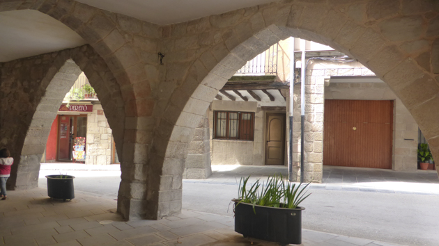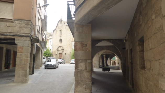 Hi entrem pel de S.Roc, i pel carrer Major arribem a la plaça, envoltada de grans portals adovellats i llindes esculturades, on destaca l’església gòtica de Sta. Maria.