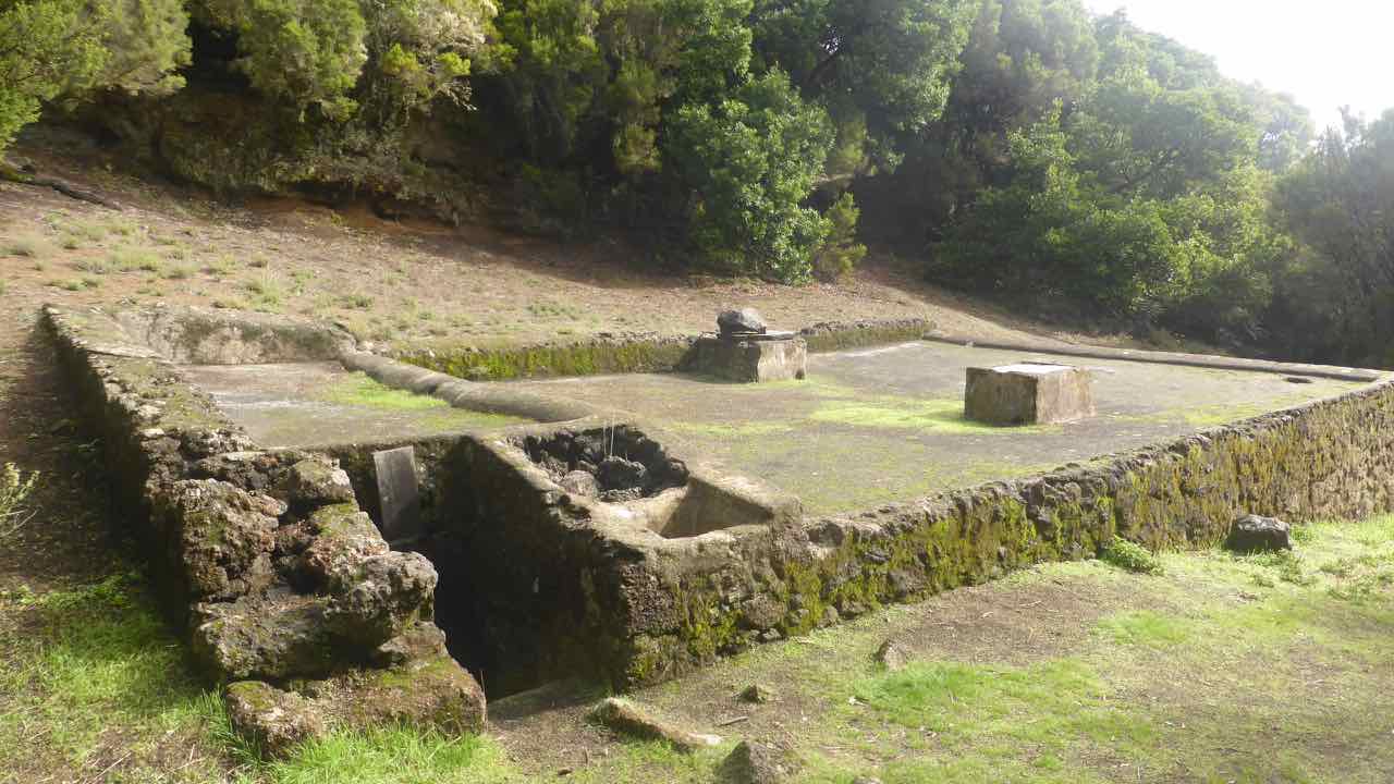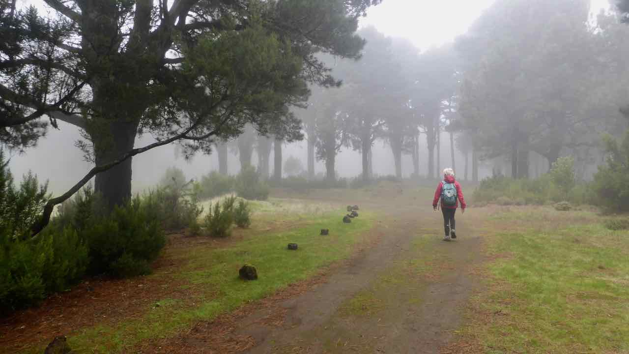 Dels dos miradors ens en passem un, per falta d’indicacions i perquè la boira és espessa; sort que el Maps ens ho indica molt bé, retornem i trobem el mirador. Els rètols estan trencats i el plafó indica que la caldera té 450 m de diàmetre i un desnivell de 160 m, una banda amb parets de cendra, en l’altra vegetació, a causa dels vents alisis. Però no veiem res, per la boira. Comença a ploure, o potser és la boira ploranera, no ho sabem. Busquem l’altre mirador de Fireba, coincidint amb el GR 131, el seguim, i el trobem: tampoc es veu res, però en lloc de seguir les marques blaves, ara que les hem retrobades, continuem pel GR, paral·lel a la carretera, fins al pàrquing, així no hi ha pèrdua, deixant, per tant, el mirador de Llanía volgudament, perquè avui, de mirar, res de res.