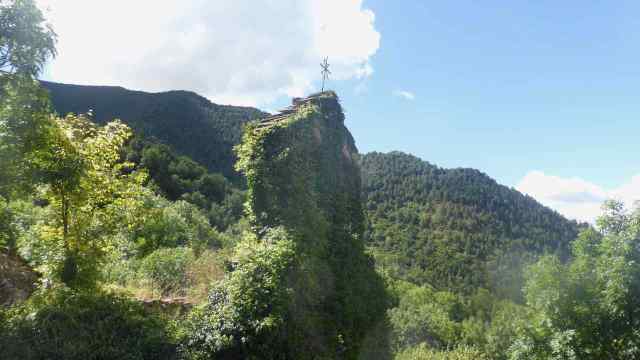 La façana va vestida de verd i els dos forats de l’espadanya semblen dos ulls d’una cara. Dalt de tot hi ha una creu diferent de les habituals, llatines (hi ha una història curiosa, en relació amb aquesta creu). Passa un excursionista i ens saluda. Va ràpid. No devia ser fàcil viure aquí dalt. Silencis i buits. Un xic de malenconia. Un tastet de misteri. Tornem pel mateix camí. Podríem arribar a Durro, a Iran o a Cóll, però ho deixem aquí.