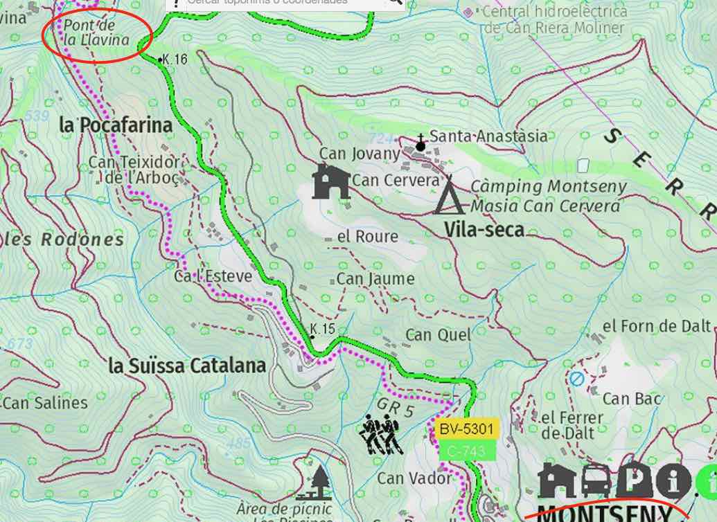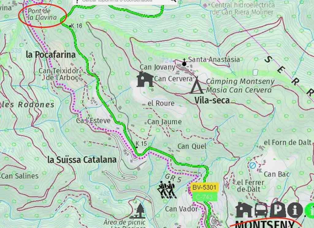 A baix del poble agafem el GR-5 i caminem paral·leles a la riera de S. Marçal per una pista bona fins arribar al pont de la Llavina.