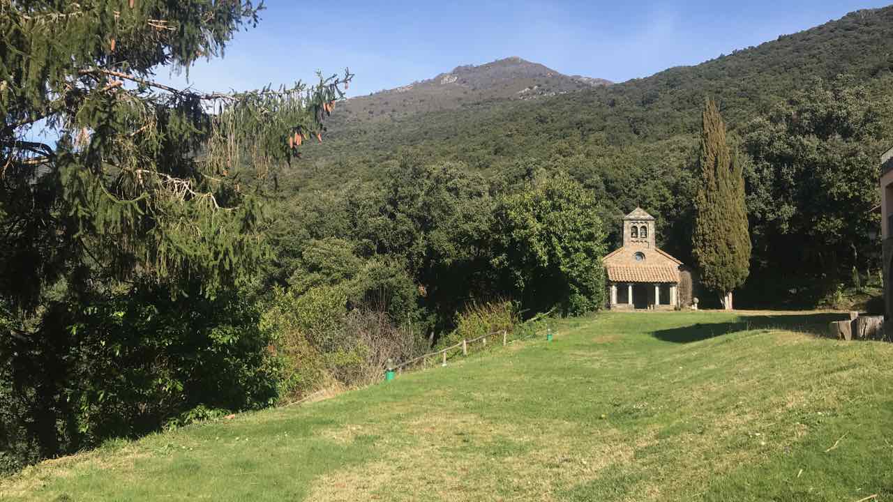 El camí continua amunt fins arribar a l’ermita de S. Martí del Montseny, a 624 m, senzilla i humil (tocant a la BV – 5301, km 18, en un revolt tancat). Passem per un alzinar, alguns pins, castanyers, brucs, estepes, heures, esbarzers… amb vistes a la vall del Tordera, les Agudes, Sant Bernat… Després de 45′ arribem al Molí de l’Adrobau. Creuem el sot i riera del Molí per un bosc dens i ombrívol, fins trobar la font del Vilar i la riera de la Castanya i en pocs minuts s’arriba al Vilar de la Castanya, una masia restaurada, amb taules de picnic a l’exterior. Es deixa el GR-5 quan el trobem a l’esquerra i continuem per la pista per enfilar-nos cap a la masia de Can Boscas, per on passem fins que trobem un indicador de l’ermita de S. Cristòfol de la Castanya, de cara a la gent que ve de l’altra banda, del Brull. Pugem per allà i hi arribem. Es té constància de l’existència del terme de la Castanya des de l’any 993. El s. XI hi havia un temple, s’hi han fet reformes, i unes pintures murals gòtiques que hi havia es van traslladar al Museu de Vic.