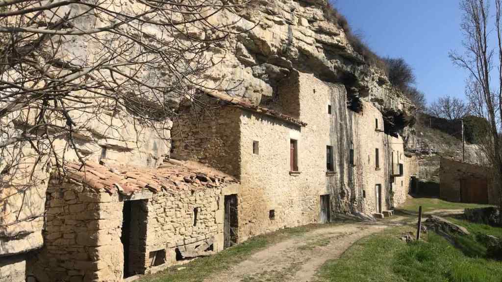 Continuant la pista paral·lela a la riera arribem a Esplugues, una gran bauma edificada amb grutes de l’època troglodítica, habitada des de l’antiguitat fins a finals del 2002. Els primers repobladors van fer construccions molt rudimentàries adossades als marges: feien servir la roca com a paret de fons i allisaven el terra per a sòl de l’habitatge; també feien forats per empotrar-hi bigues. L’any 1192 hi ha la primera documentació sobre aquesta masia. L’entorn és maco, relaxant, amb un pont romànic i forma part de l’Ecomuseu del Moianès.