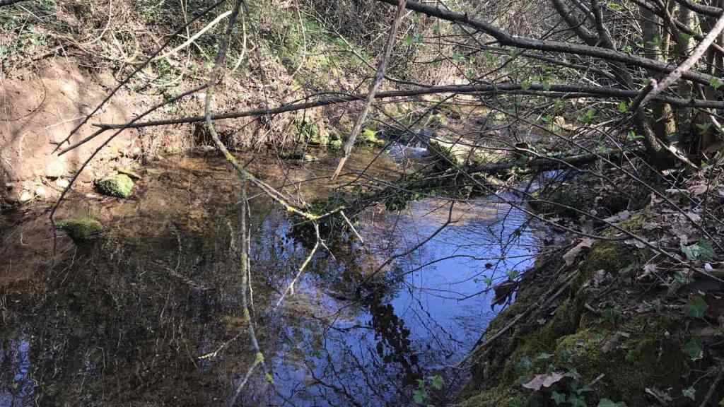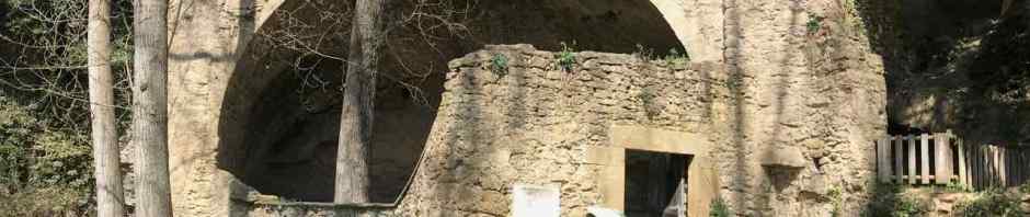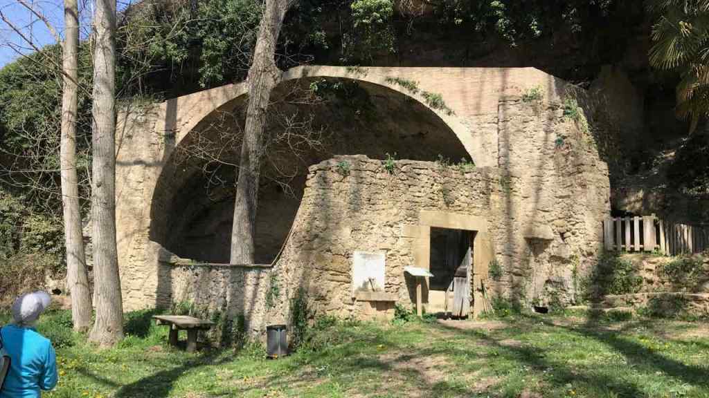 Travessem el pont i retornem per l’altra riba per un sender enmig del bosc. La riera queda, novament, avall, fins que ens desviem per anar a la font de la Vinyota, sota unes petites baumes. Hi ha ombra, taules i accés a la riera, però de la font… res.