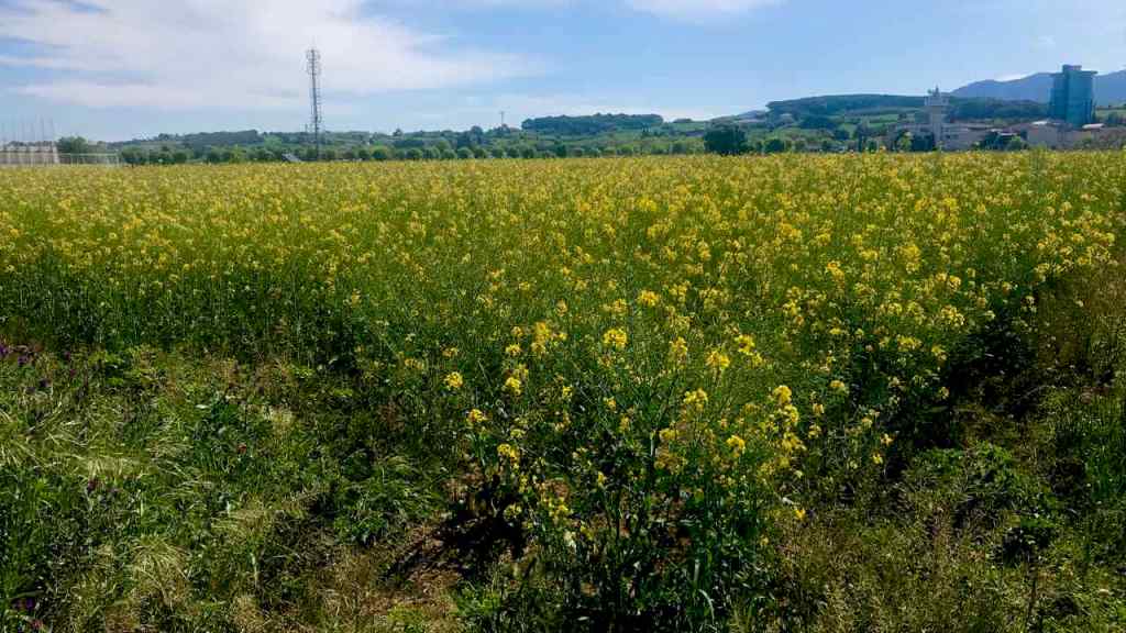 Continuem el camí envoltades de vegetació típica de la zona i l’estació, sobretot borratges i ginestes. Després dels murs de l’empresa Ferimet de recuperació fèrrica, hi ha un gran camp de colza, florit. Hem passat els grans números del km 2, del 3