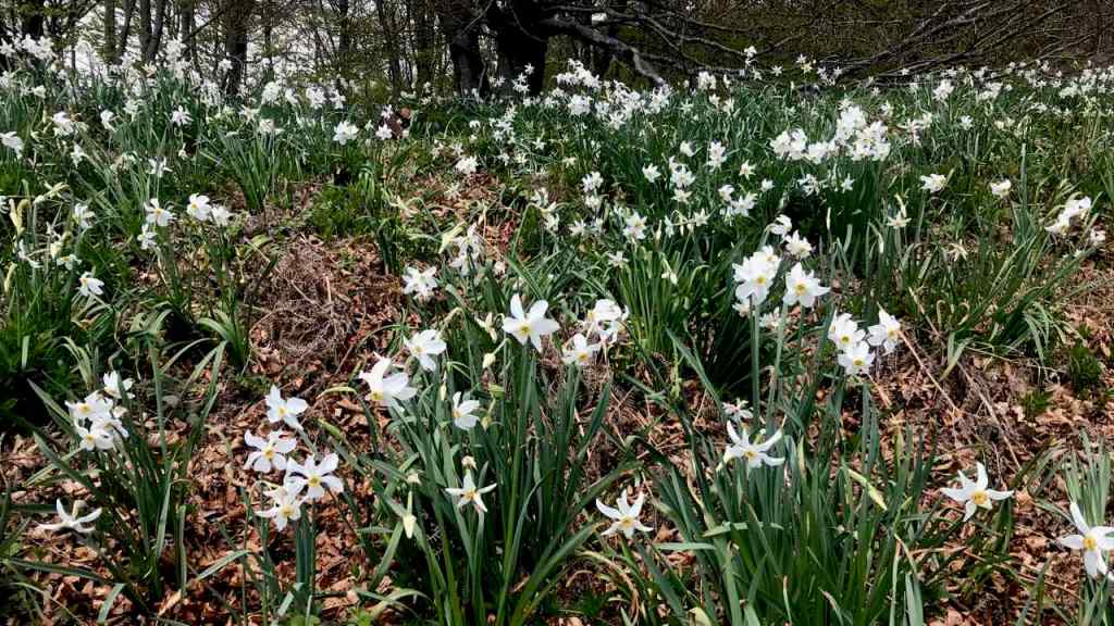 Continuem amunt per un camí dins d’una fageda. Les amigues que ens acompanyen, bones coneixedores de l’indret, ens diuen que els faigs són arbres insolidaris, perquè no deixen créixer els del voltant, com roures o pins. Hem vist també uns quants arbustos florits de boix grèvol. A prop del segon esquei, a la dreta, hi ha una extensió gran de narcisos blancs amb vistes. Emocionant.