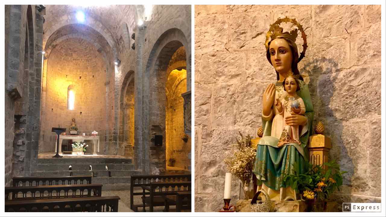 De tres naus, l’absis central s’eleva, al presbiteri, per sobre del paviment de la nau, i allotja una cripta que n’ocupa tot l’àmbit; hi baixem per unes escales laterals i trobem tres finestres curioses d’una esqueixada que perforen els graons d’accés al presbiteri i permeten veure la nau. L’església es va salvar i és l’actual parròquia de Sopeira. Sortim al lloc on hi havia el claustre, que no en queda res a part del quadrat al terra, tot ho varen anar robant després de la desamortització, incloses les columnes. Ens ho explica una dona que fa de guia, filla del poble, que ha viscut de prop la rehabilitació.