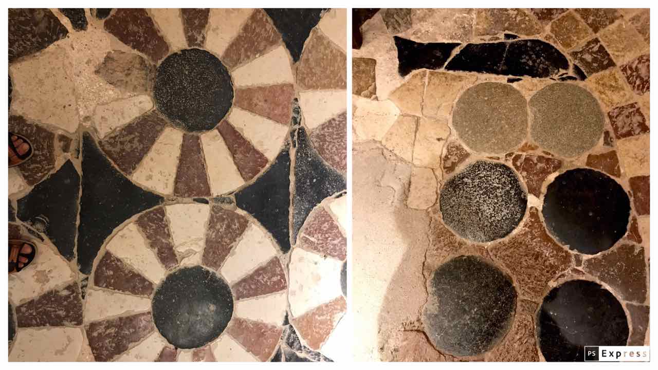 Al terra hi ha figures de còdols i al presbiteri es conserva un paviment romànic especial, amb una sanefa de quadrats, col·locats en diagonal, que combina peces vermelles i blanques, i envolta un plafó format per tres rengles de cercles o rodes. Un plafó té una figura de peix.