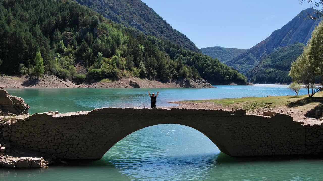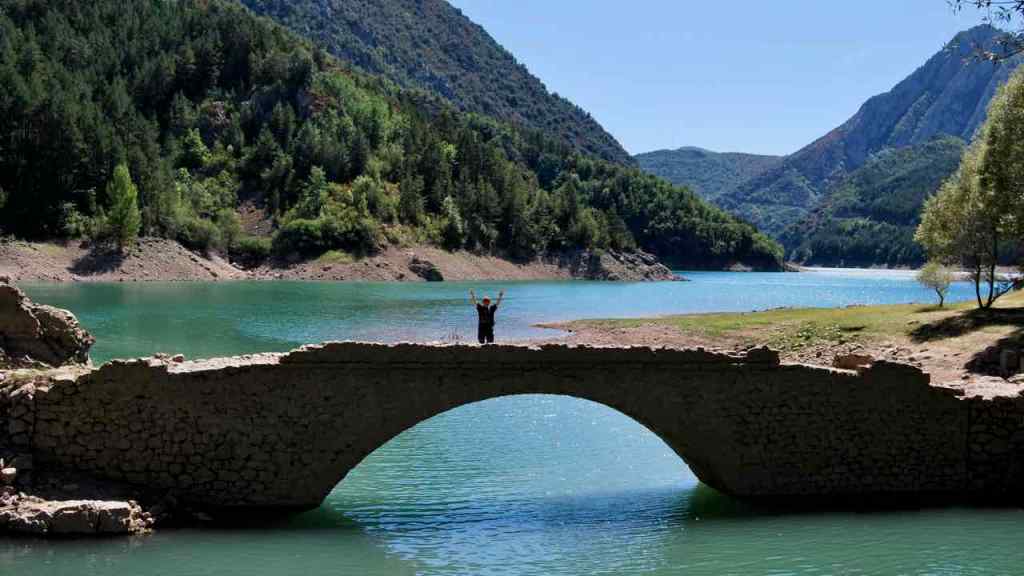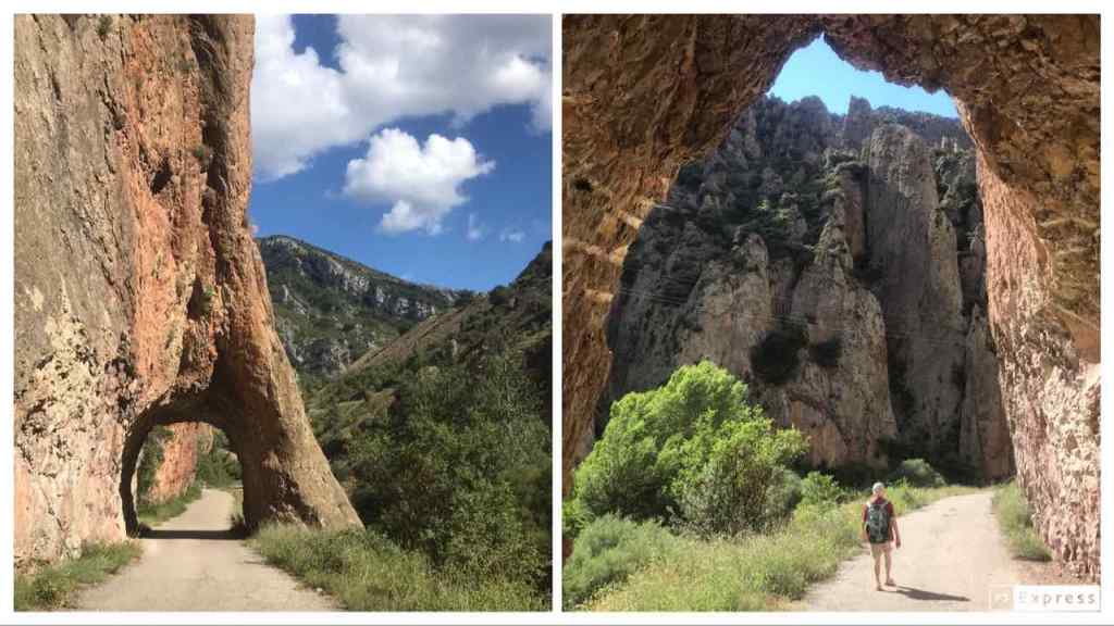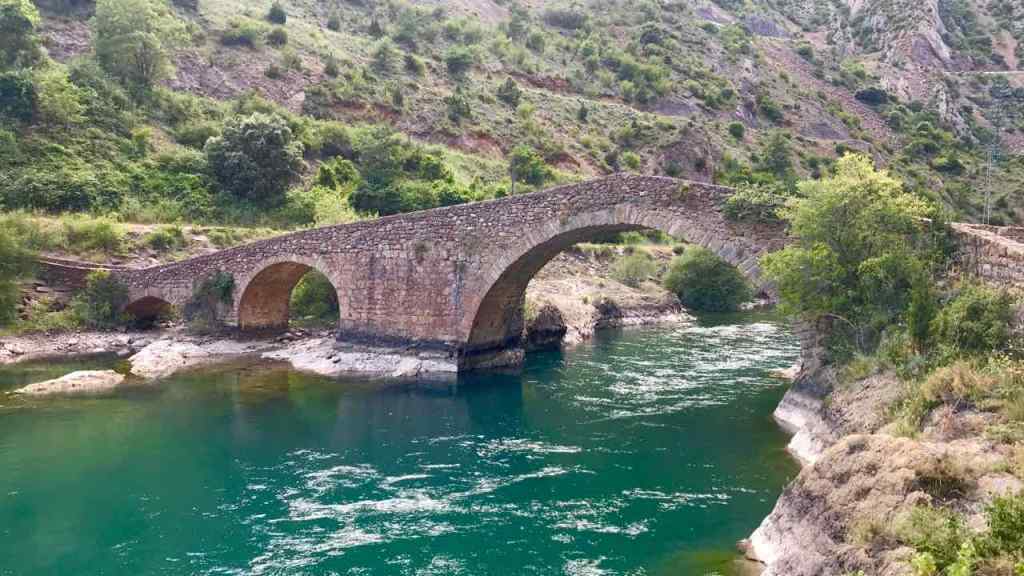 Sortint, caminem per l’anomenat “Camí de l’Aubada” pel voltant del riu. Cal creuar el pont medieval (a l’altra riba hi ha la central hidroelèctrica) i vorejar-lo avall. Les fosques aigües del riu ofereixen un mirall perfecte on queden reflectits els arbres de ribera, el monestir i el poble. Després retornem i anem en sentit contrari, travessant el riu per un altre pont, modern. Pel congost, anem fins al peu de la presa, que fa 125 m d’alta, després de passar sota un túnel-pont natural que fa goig. És zona de coves i aus rapinyaires. Acabem al nucli del poble, tot fent una cervesa, al costat d’una taula amb una iaia i la seva cuidadora. Seiem sota l’ombra generosa d’un arbre, amb esplèndides vistes al riu i a la piscina.