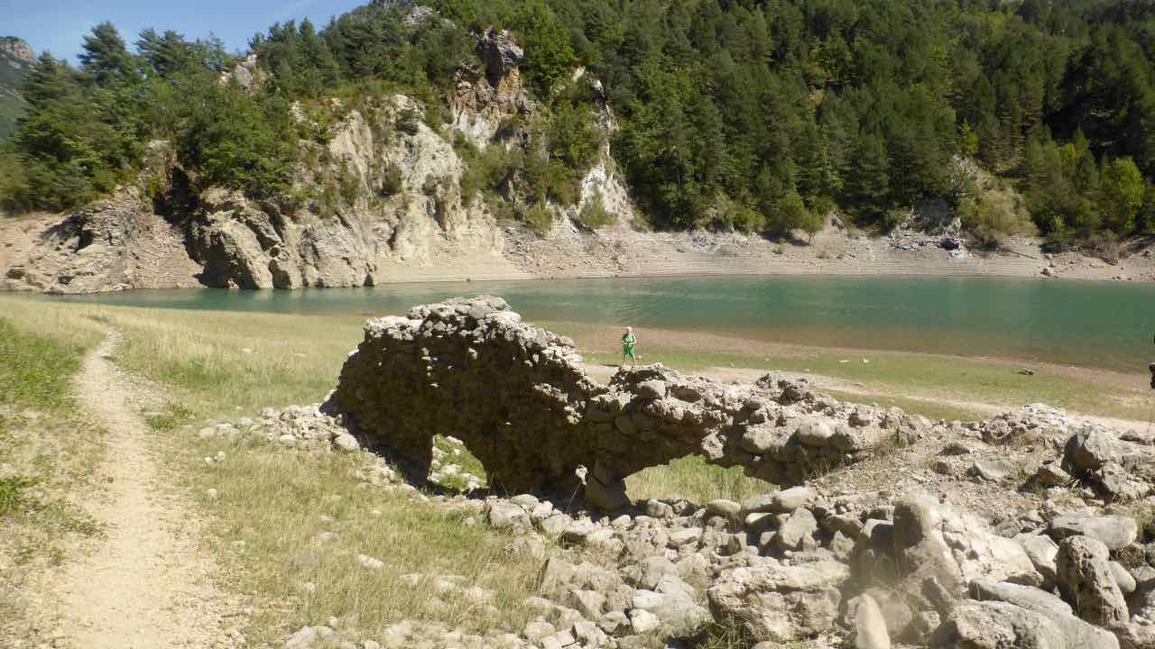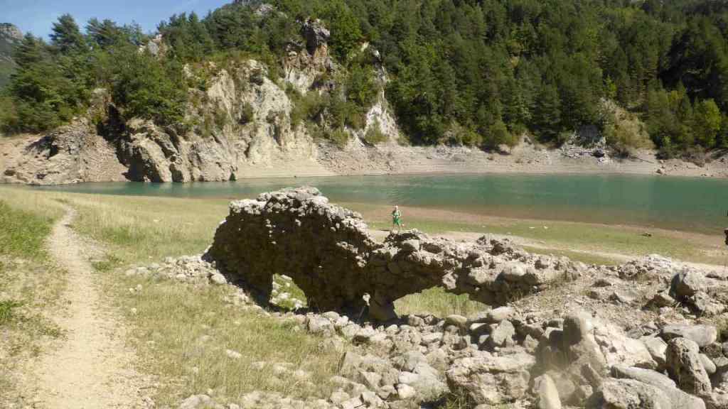El primer, al nord, 3 km abans d’arribar a Pont de Suert per la N-260. Aparquem en una zona de pícnic abans d’entrar al túnel de Lavaix on hi ha la font de Mena. Un sender baixa fins a l’embassament d’Escales, on trobem les ruïnes del Monestir de Sta. Maria de Lavaix. El camí forma part de la “Ruta de l’aigua”. El color de les aigües està preciós i tenim la sort que no cobreixen, com altres cops, les pedres de l’antic monestir.