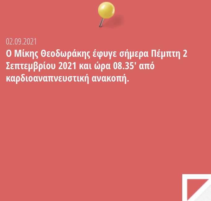 El 2016 era a Xios celebrant un Primer de Maig amb la gent del KKE (Partit comunista), del qual Teodorakis n’era membre. Aleshores ja sabia que no canten la Internacional, com nosaltres, sinó diferents cançons de lluita. Érem a la plaça principal de la capital, la mateixa que anys després acolliria els centenars de refugiats de la guerra de Síria. Van llegir un fragment del poema Epitafi de Iannis Ritzos escrit el 1936 en record de 12 treballadors morts a Salònica en una manifestació. El 1959 Teodorakis va musicar el poema. La cançó “On ha volat el meu fill” és el cant da la mare que ha perdut un fill. Escolteu: Πού πέταξε τ’ αγόρι μου. Pell de gallina.