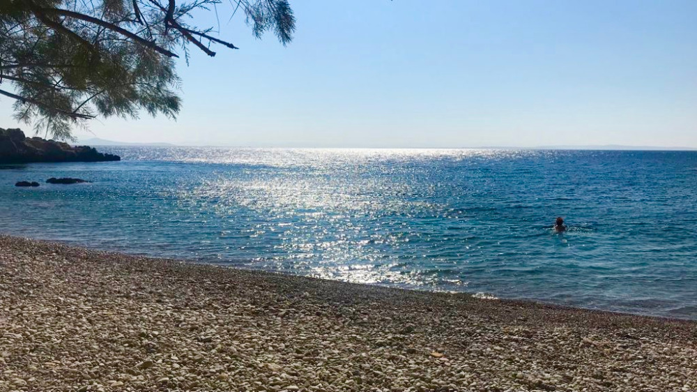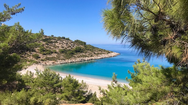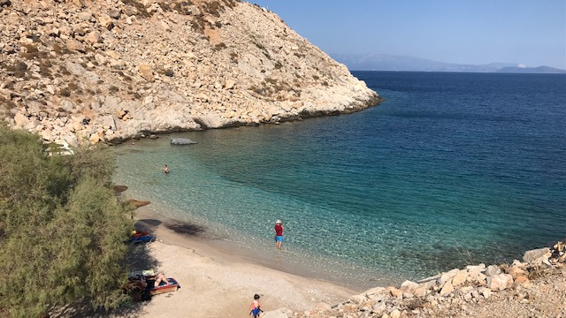 De fa uns anys, el govern de l’illa va decidir fer concessions a joves perquè es fessin càrrec d’algunes cales boniques. A canvi de mantenir-les netes i cuidades, ells posaven para-sols i gandules, un bar, i cobraven el servei. Però quan consideren que la temporada acaba, a finals de setembre, ho treuen tot i la cala torna a quedar verge. És el cas de la platgeta de Glaros, en un racó privilegiat sota una pedrera, d’aigües turqueses, que ara tornem a tenir a la nostra disposició tal com és. Com totes les platges de l’est de l’illa, és molt propera a la costa turca, i el senyal d’internet hi arriba potent. A la que hi ets, t’arriba al mòbil un SMS de benvinguda a Turquia. Alguna vegada no ens hi hem fixat i hem “llepat”!