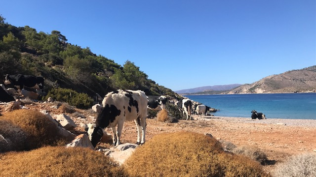 A terra, algudes cagades grans, pel tamany, de vaca. Quan hem pujat a veure la torre, al principi del camí, amagades sota unes ombres, les hem vistes. Quan hem baixat, n’hi havia un bon grupet a la platja, tocant l’aigua. Algú pot pensar que s’ha perdut la imatge de platja idílica. En algunes illes ens ha passat d’arribar a una platja de que lluny vèiem fantàstica i en arribar-hi, trobar-la plena de cagades de cabra, de manera que no sabíem ni on posar la tovallola. Elles havien arribat primer. En el cas d’avui, les vaques només ocupaven un racó de platja, deixant per als humans, una gran part. Això sí, a la foto que pengem a Instagram només hi posarem la part bonica, no fos cas que l’Oficina de Turisme de l’illa pensés que volem espantar els turistes.