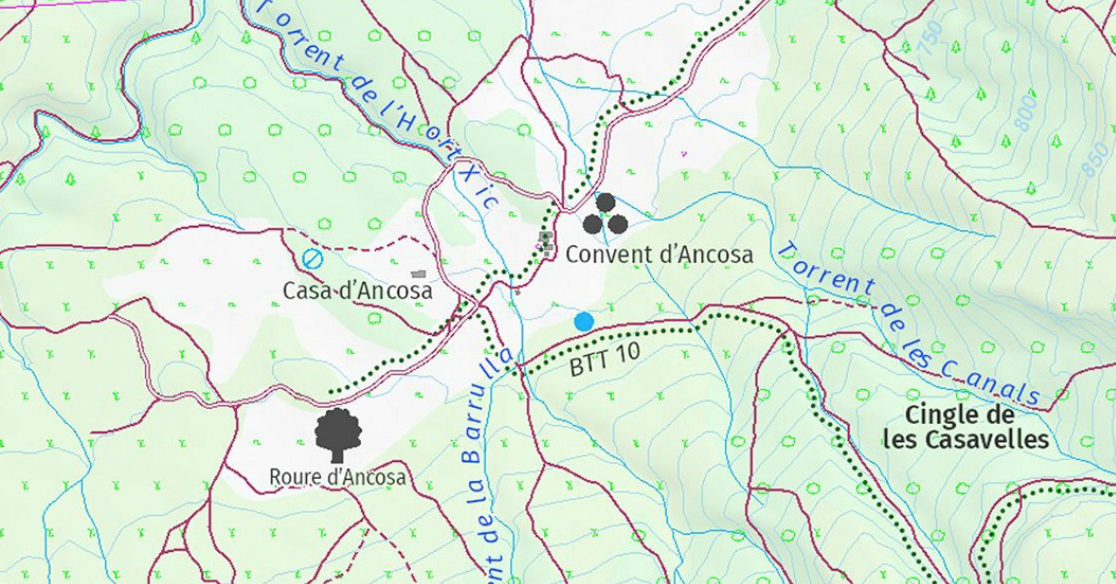 Uns 300 m més endavant hi ha el Roure d’Ancosa d’una alçària de 20 m i un perímetre del tronc de 4 m i mig. És un magnífic exemplar de tronc ample on s’acumula aigua que es feia servir les nits de sant Joan per protegir els infants dels mals.