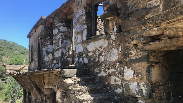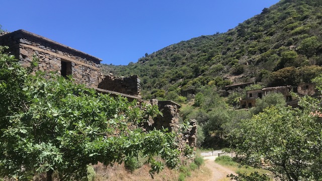 Caminem per una pista ampla, de baixada, fins al torrent, a 1,5 km. De lluny estat es veu el poble, pedres negres que es confonen amb la muntanya. Ens aturem a l’església de S. Antoni, nova, forta, blanca i tancada. A baix hi ha tres paletes treballant en la rehabilitació de l’escola, al nivell del riu. La majoria de les cases queden a la nostra dreta, però no s’hi pot pujar perquè no hi ha carrers ni camins. A l’altra banda, tocant al riu, en queden algunes més, en molt mal estat.