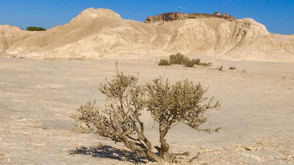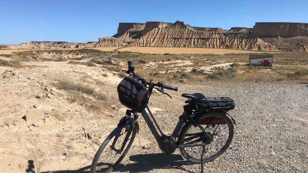 Des de la ciutat de Tudela, dediquem 2 dies a la visita de les Bardenas. El primer anem a la Bardena Blanca per la N 134 i abans d’Arguedas, prenem la pista fins al Centre d’informació, on ens proposen fer la circumval·lació per la pista perimetral de 34 km, amb parades en els punts d’interès i caminant en alguns dels llocs permesos. La calor és una limitació clara. Hi ha molta gent, sobretot ciclistes francesos. No es pot sortir dels camins permesos perquè hi ha moltes zones militars. Fem la volta en el sentit contrari a les agulles del rellotge. Des del primer mirador veiem el que ens envolta, a 360º, inclòs el cim del Moncayo. La pista asfaltada s’acaba aviat, just després d’arribar a la base militar. Girem a la dreta… i anem fent
